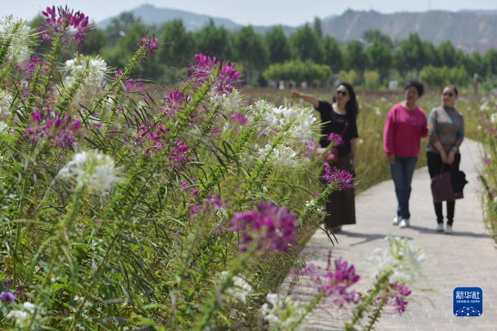 9月4日,游客在永靖縣劉家峽鎮黃河花堤上賞花。