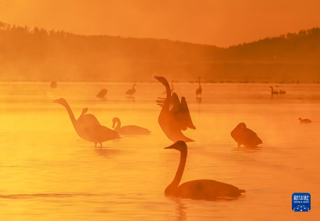 冬日清晨,山東榮成大天鵝國家級自然保護區晨霧裊裊,大天鵝在晨曦中游弋覓食、起舞飛翔,吸引眾多游客前來(lái)觀(guān)賞拍照。