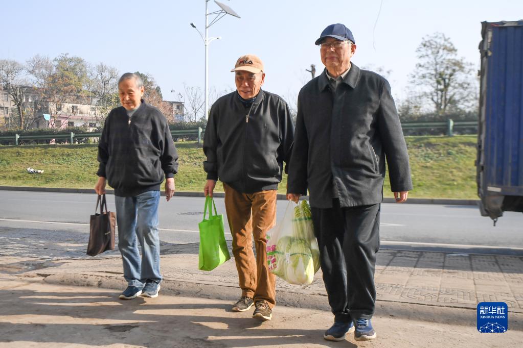 12月23日,魏鎮、馬利民、余國基(右起)提著(zhù)備好的面、菜來(lái)到寶南飯店。新華社記者 薛宇舸 攝