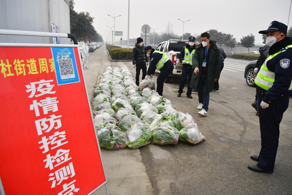 1月5日,民警在西安市長(cháng)安區郭杜街道周家莊村外幫忙搬運配送給居民的蔬菜。新華社記者 邵瑞攝