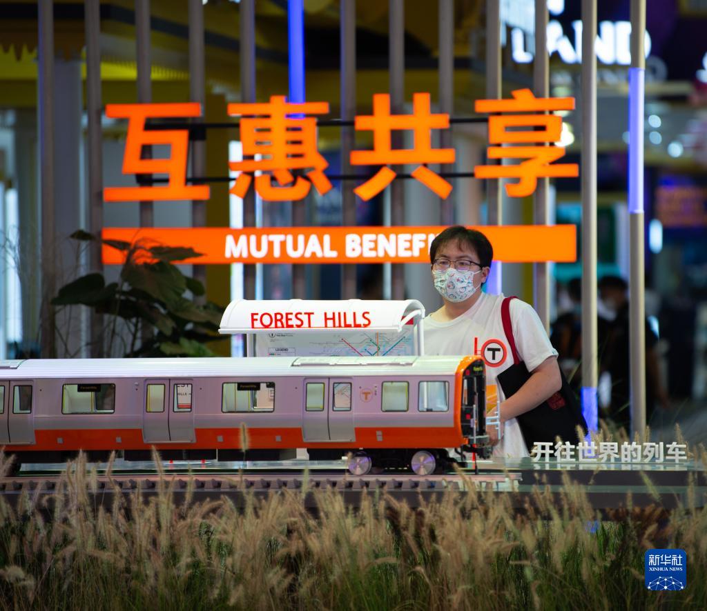 2021年9月4日,在位于北京的國家會(huì )議中心中國服務(wù)貿易發(fā)展成就展上,觀(guān)眾參觀(guān)中國軌道交通出口裝備模型。新華社記者 陳鐘昊 攝