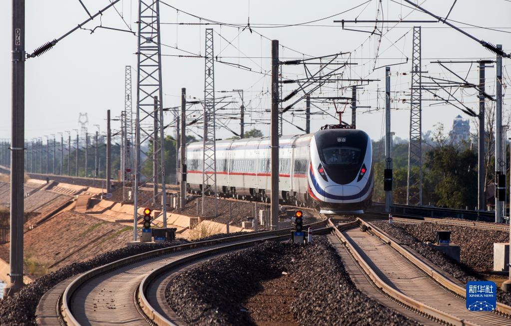 2021年12月3日,“瀾滄號”動(dòng)車(chē)組列車(chē)駛離老撾萬(wàn)象站。當日,中國昆明站內的復興號“綠巨人”、老撾萬(wàn)象站內的“瀾滄號”動(dòng)車(chē)組列車(chē)緩緩開(kāi)動(dòng),開(kāi)啟一段跨越山河、相互奔赴的旅程。這標志著(zhù)連接昆明和萬(wàn)象、采用中國標準的中老鐵路全線(xiàn)開(kāi)通運營(yíng)。新華社發(fā)(凱喬攝)