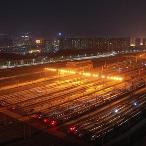 1月16日晚,動(dòng)車(chē)組列車(chē)??吭谥袊F路蘭州局集團有限公司蘭州車(chē)輛段蘭州西動(dòng)車(chē)運用所整備場(chǎng)上,為1月17日開(kāi)始的2022年春運做好準備(無(wú)人機照片)。新華社記者 杜哲宇 攝