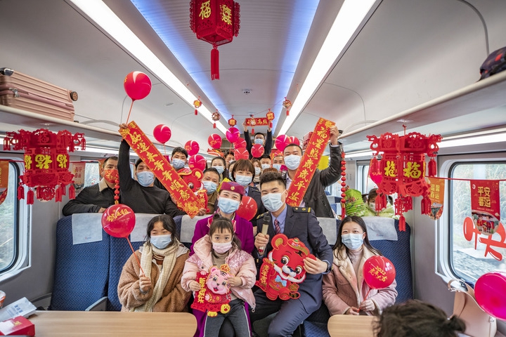 2022年1月28日,在重慶西北環(huán)線(xiàn)C451次列車(chē)上,中國鐵路成都局集團有限公司重慶客運段和重慶鐵路公安處的青年職工與旅客一起合照。新華社記者 黃偉 攝