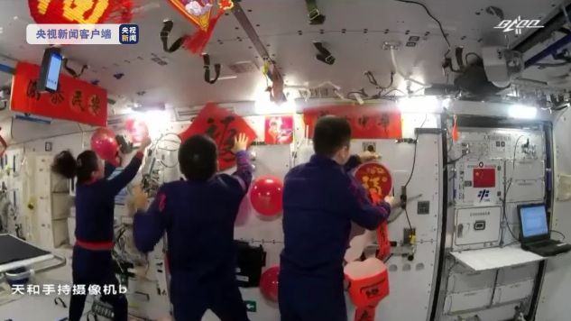 天宮空間站這幾天被布置一新,透過(guò)鏡頭,我們看到,航天員翟志剛正在將福字張貼在艙壁上,航天員王亞平將一張年畫(huà)掛在了艙頂上,航天員葉光富一邊拿著(zhù)對聯(lián)、一邊調整福字的擺放,大家忙得不亦樂(lè )乎。