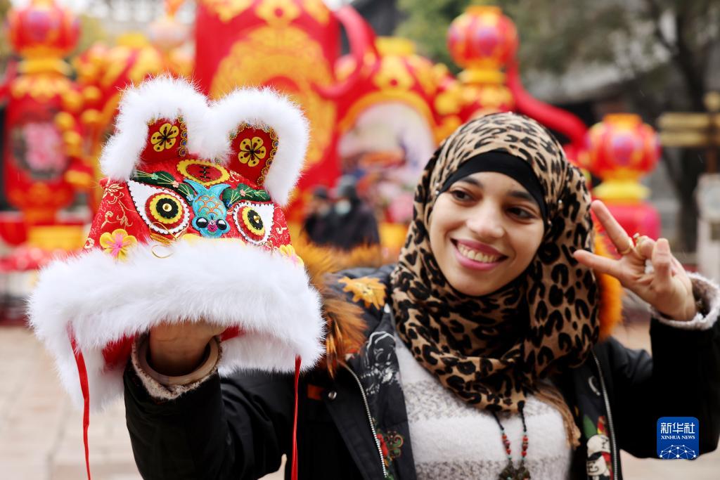 1月22日,來(lái)自埃及的“洋媳婦”艾米娜在山東省棗莊市臺兒莊古城展示中國傳統虎頭帽。艾米娜已嫁到臺兒莊10多年,喜愛(ài)中國的傳統文化。