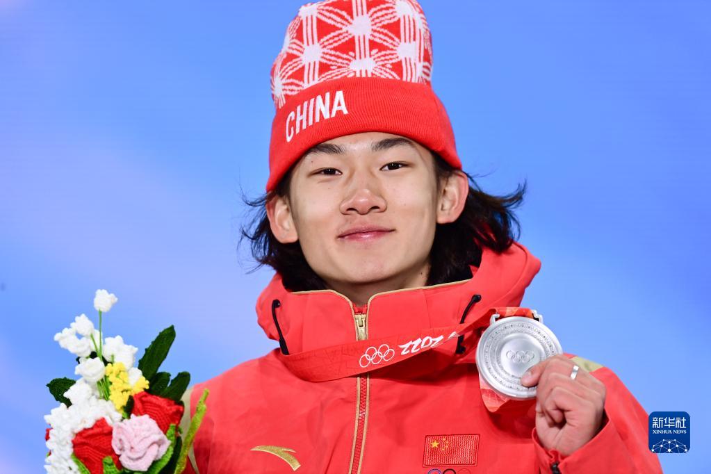 2月7日,亞軍中國選手蘇翊鳴在北京2022年冬奧會(huì )單板滑雪男子坡面障礙技巧獎牌頒發(fā)儀式上。新華社記者張宏祥攝