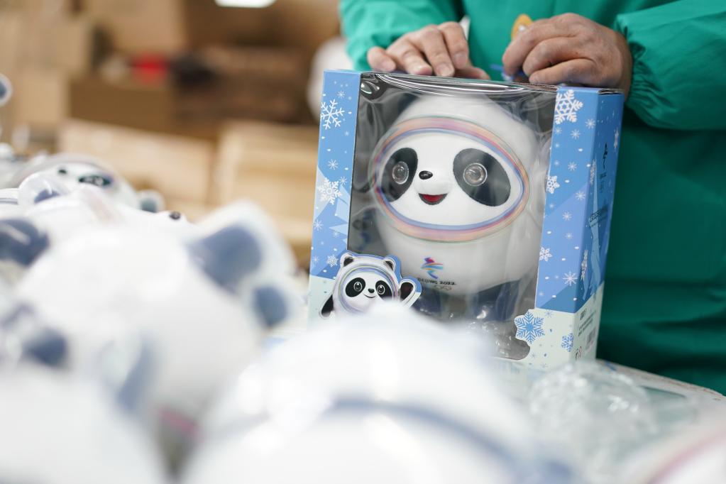 2月8日,工人在特許生產(chǎn)商的車(chē)間里包裝“冰墩墩”。(新華社記者 季春鵬 攝)