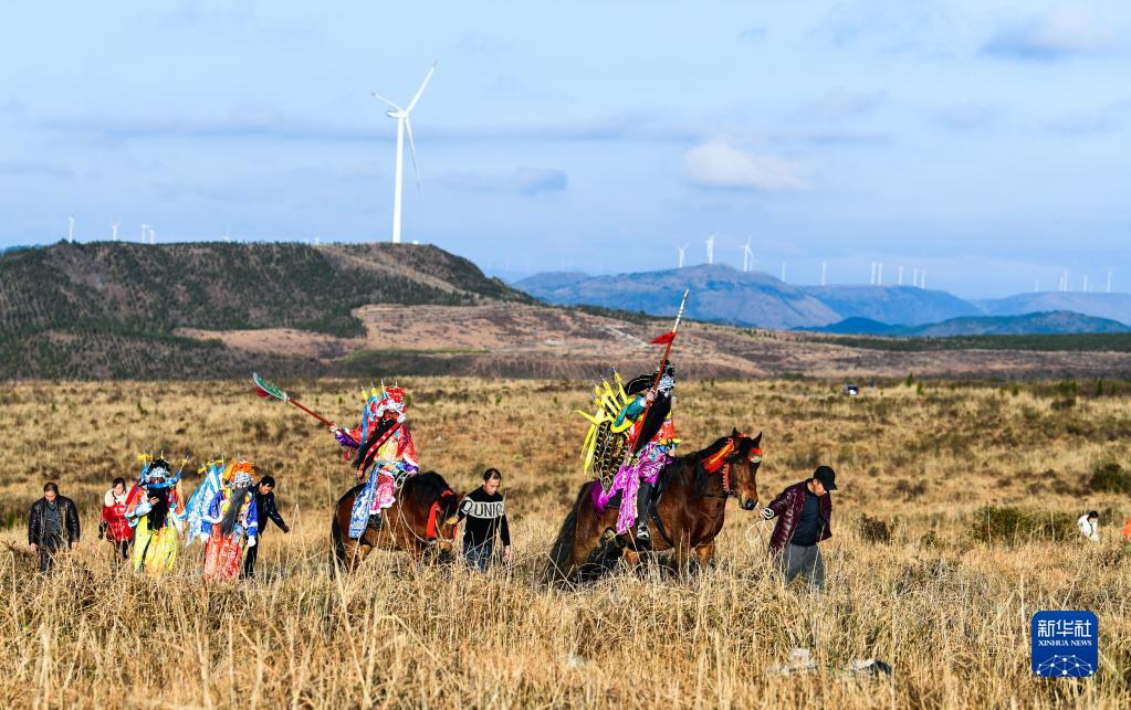 2月7日,龍里太平花燈戲的成員前往村子附近的山頂練習花燈戲。