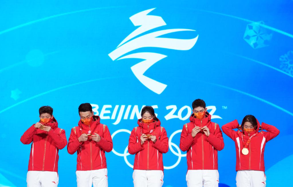 2月6日,中國隊選手范可新、任子威、曲春雨、武大靖、張雨婷(從左至右)在獎牌頒發(fā)儀式上。新華社記者鞠煥宗攝