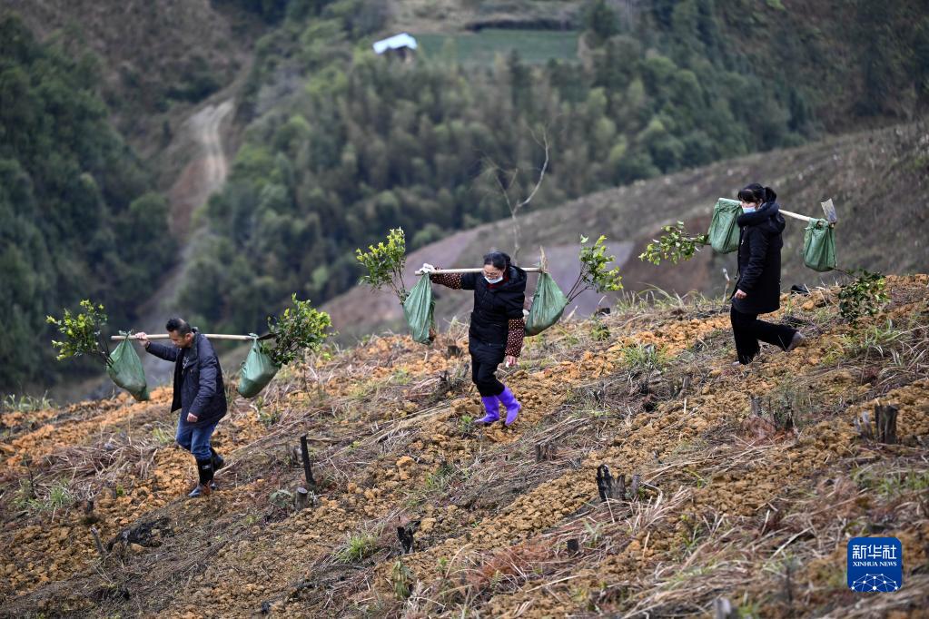 2月11日,在廣西柳州市三江侗族自治縣八江鎮,人們挑著(zhù)油茶苗準備上山種植。