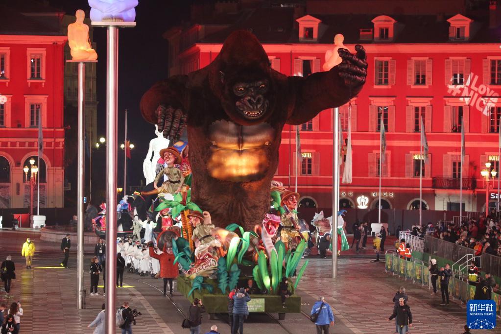 這是2月12日在法國南部城市尼斯拍攝的狂歡節花車(chē)夜間游行現場(chǎng)。