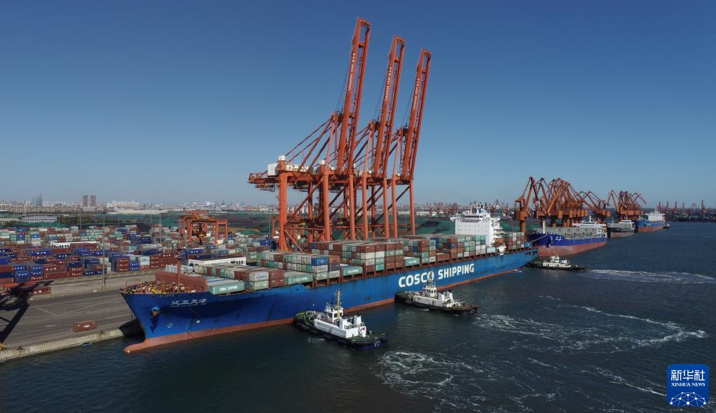 一艘輪船在拖輪的協(xié)助下向唐山港京唐港區集裝箱碼頭靠泊(2021年10月23日攝,無(wú)人機照片)。新華社記者 朱旭東 攝