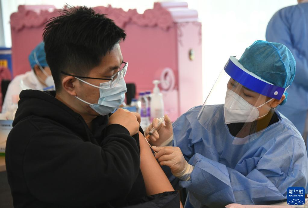 2021年12月7日,北京市海淀區上地街道組織醫護人員來(lái)到海國瑞業(yè)科技園,為園區內的企業(yè)員工進(jìn)行新冠疫苗加強針接種。新華社記者 任超 攝