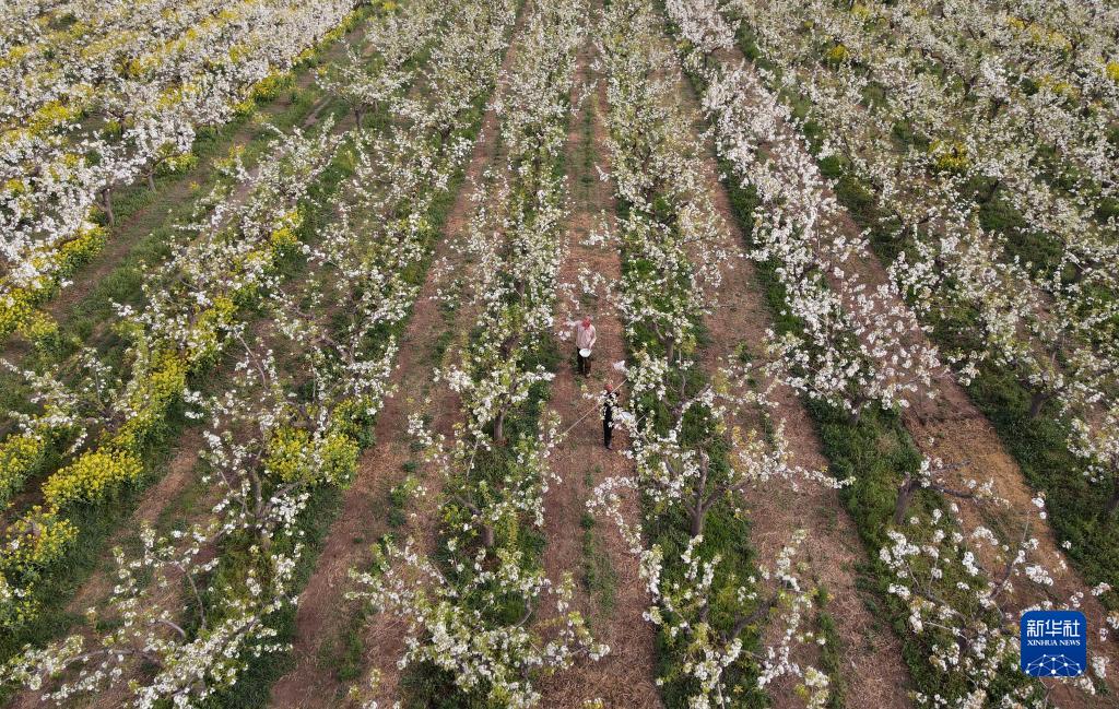 4月12日,河北省石家莊市深澤縣大橋頭鎮農民為梨花授粉(無(wú)人機照片)。