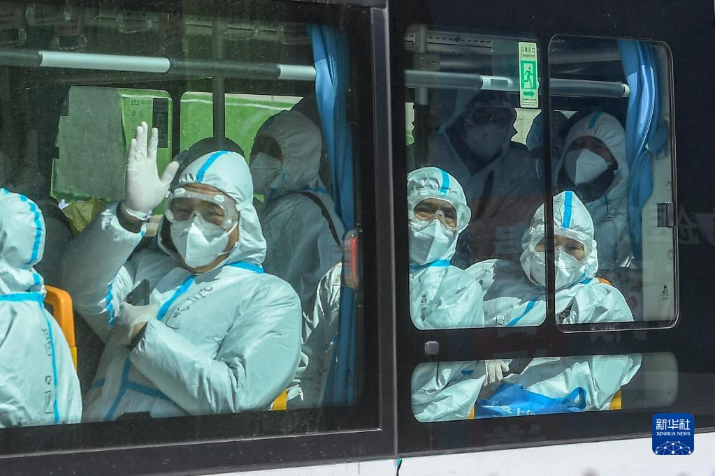 4月6日,在吉林省吉林市高新北區方艙醫院,出院患者朝車(chē)外招手致意。新華社記者 張楠 攝