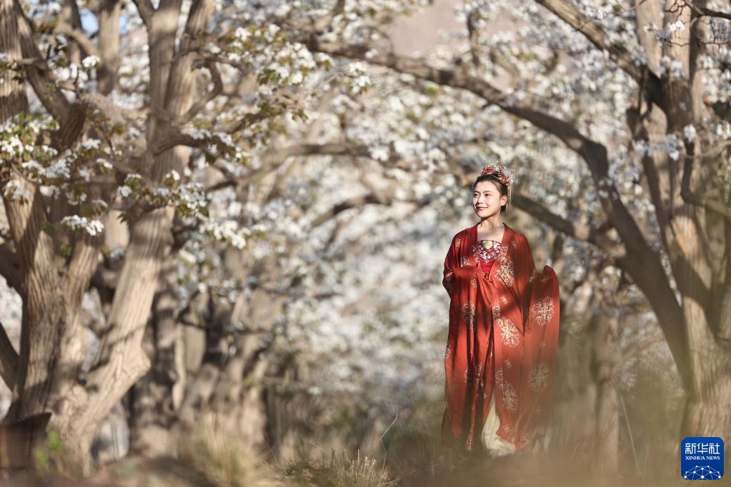 4月7日,景區工作人員在甘肅省蘭州市皋蘭縣什川鎮百年梨園內進(jìn)行表演。受疫情影響,景區組織工作人員在梨園內直播,邀請人們“云賞花”,滿(mǎn)足公眾賞花需求。新華社記者 陳斌 攝
