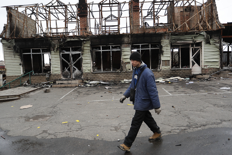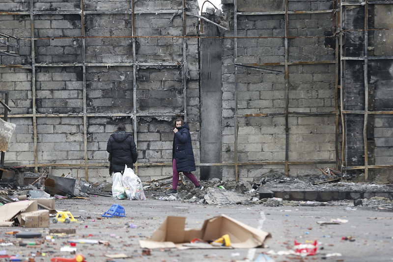 4月14日,馬里烏波爾當地居民從被損壞的建筑旁走過(guò)。新華社發(fā)(維克托攝)