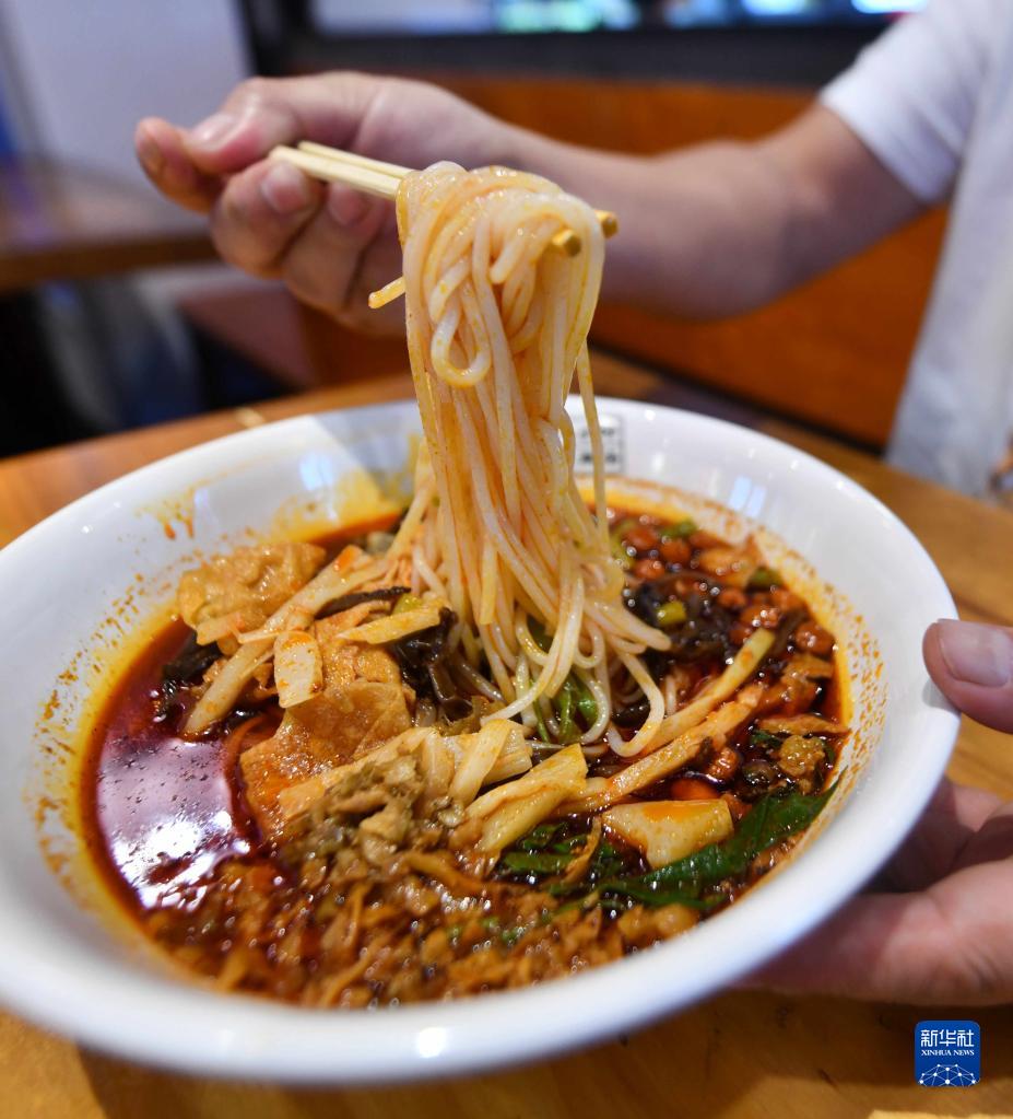 在柳州市一家螺螄粉實(shí)體店,顧客在品嘗螺螄粉 (2021年6月4日攝)。新華社記者 黃孝邦 攝