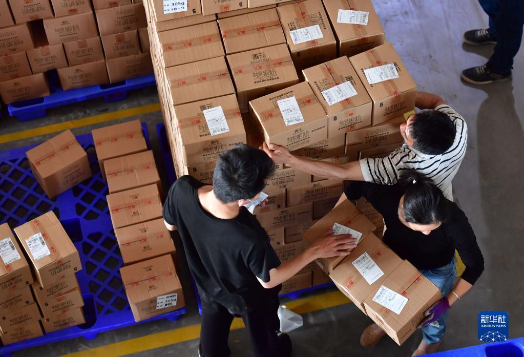 在廣西善元食品有限公司螺螄粉倉庫,工人將螺螄粉成品裝車(chē),準備發(fā)往各地(4月11日攝)。新華社記者 黃孝邦 攝