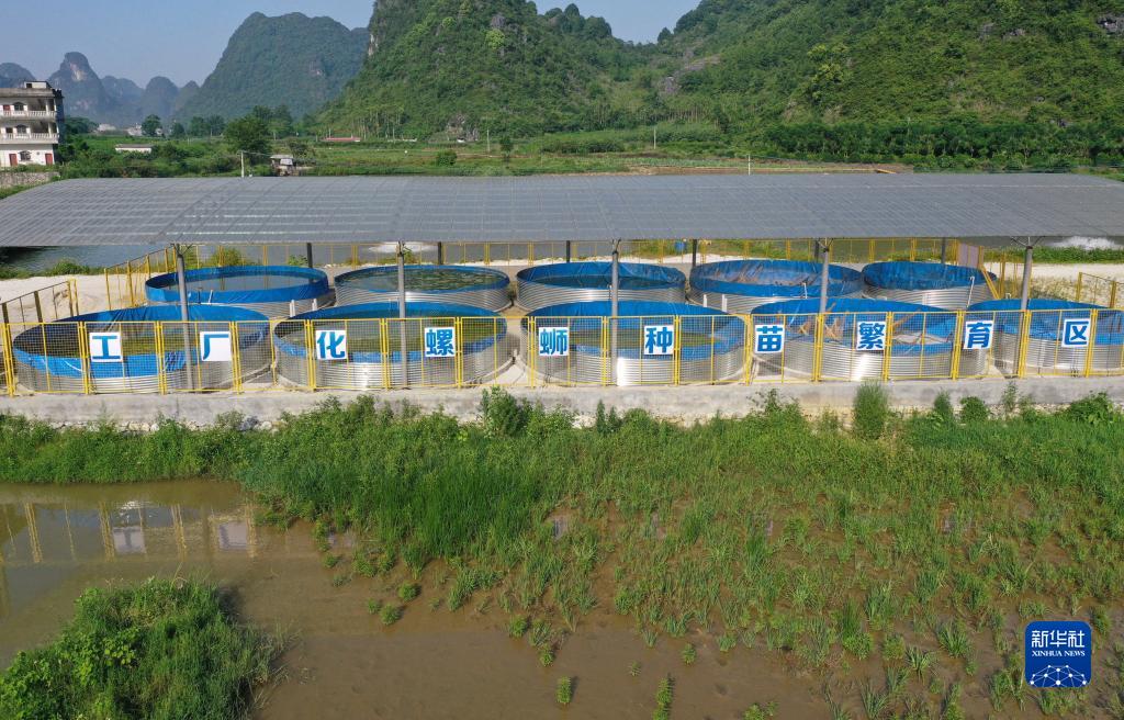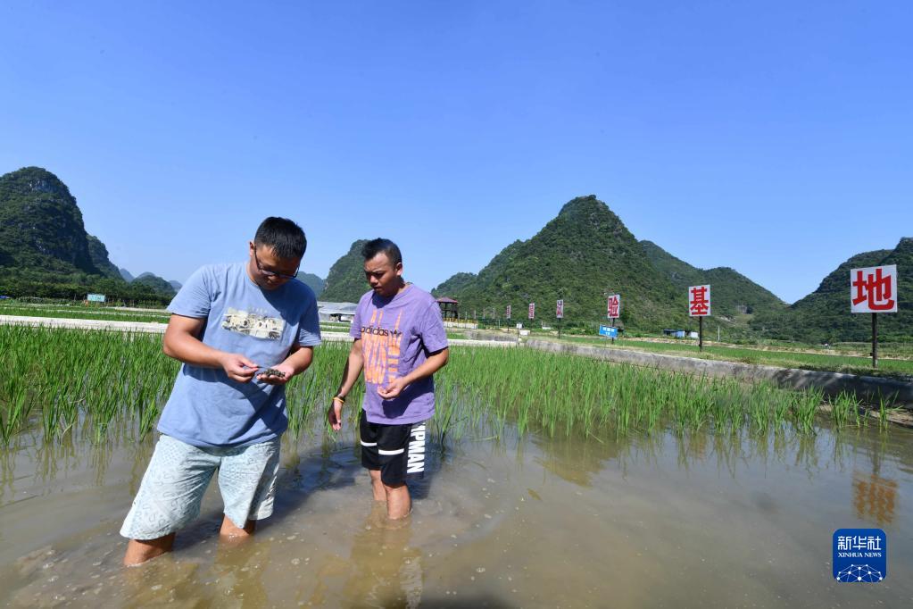 在柳州市柳江區里高鎮板六村螺螄養殖基地,技術(shù)人員在查看螺螄生長(cháng)情況(2021年6月6日攝)。新華社記者 黃孝邦 攝