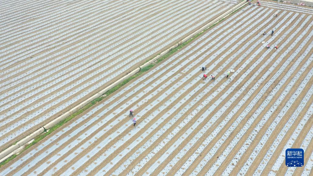在柳州市魚(yú)峰區白沙鎮王眉村柳州螺螄粉原料產(chǎn)業(yè)基地,村民在種植辣椒(無(wú)人機照片,3月16日攝)。新華社記者 黃孝邦 攝