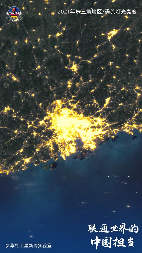 這是2021年珠三角地區的全年夜光圖。2021年,在新冠肺炎疫情的沖擊下,中國的對外貿易并未停下腳步,中國外貿城市進(jìn)出口總額排行榜中,珠三角的四座城市——深圳、東莞、廣州、佛山——位居外貿城市榜單前十。2021年,珠三角經(jīng)濟達到新里程碑,GDP突破10萬(wàn)億元。(新華社記者馬曉澄)