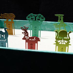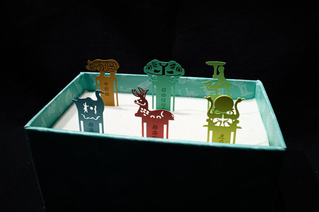 取材于彩漆木雕鴛鴦形盒、彩繪漆木臥鹿等文物制作的文創(chuàng )書(shū)簽(5月12日攝)。新華社記者肖藝九攝