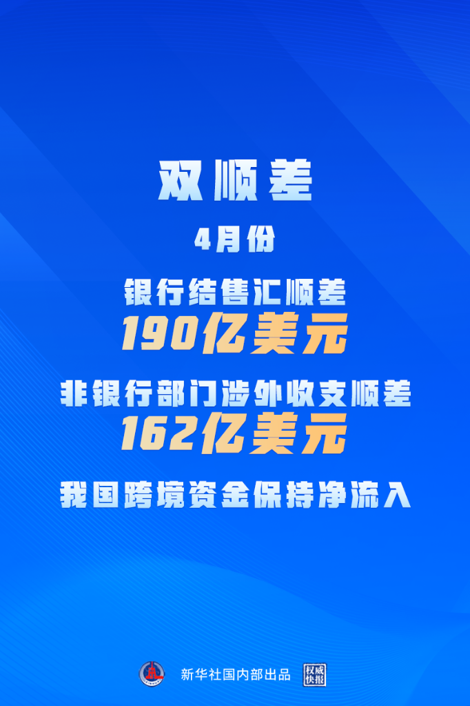 新華社北京5月17日電(記者劉開(kāi)雄、劉羽佳)國家外匯管理局17日發(fā)布的數據顯示,4月份銀行結售匯順差190億美元,與一季度月均水平相當;非銀行部門(mén)涉外收支順差162億美元,環(huán)比增長(cháng)57%。