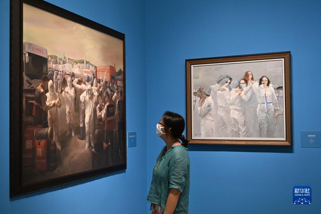 6月24日,參觀(guān)者在展覽上觀(guān)看作品《逆行出征 同心守護》。 新華社記者 李鑫 攝