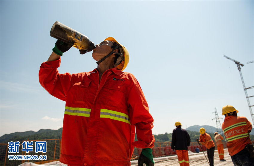 在景文高速控制性工程高嶺頭水庫特大橋施工現場(chǎng),“到中午時(shí),在大橋上面沒(méi)有遮擋,氣溫達到40攝氏度以上。但不管有多苦多累,我們都要保質(zhì)保量,爭取早日把這項目建成?!睗仓と朔鹅魳s說(shuō)。為了預防中暑,工人們的訣竅就是多喝水,他們每個(gè)人每天帶著(zhù)兩公升的水壺,每天要喝兩三壺。