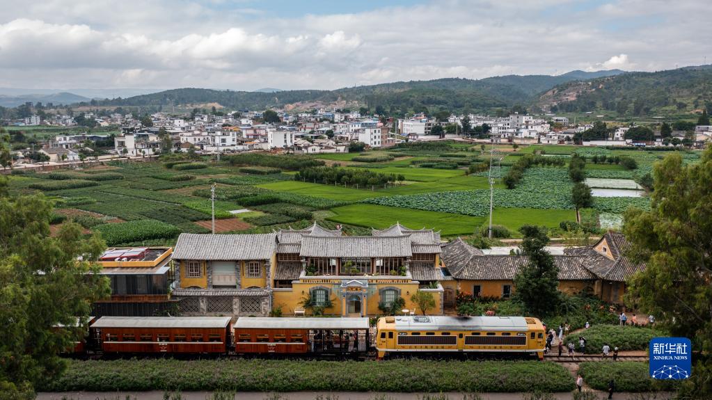 游客在云南省建水縣乘坐米軌小火車(chē)來(lái)到鄉會(huì )橋站游覽(2022年7月1日攝,無(wú)人機照片)。新華社記者 胡超 攝