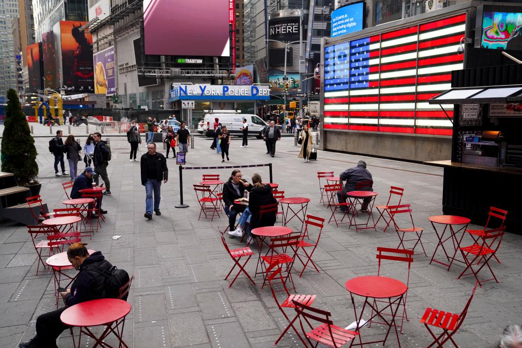 這是2022年3月7日人們在美國紐約時(shí)報廣場(chǎng)的資料照片。(新華社記者王迎攝)