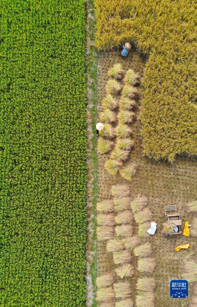 9月11日,湖南省永州市新田縣驥村鎮黃公塘村村民在田間收割水稻(無(wú)人機照片)。