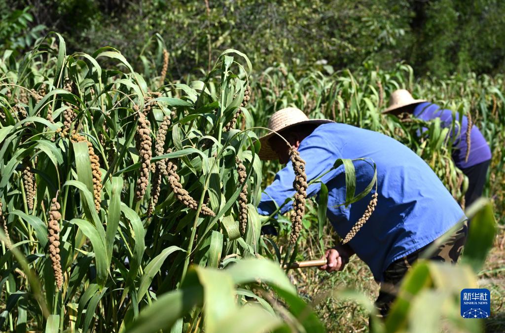 9月21日,天津市薊州區羅莊子鎮泥河村村民在收割谷子。