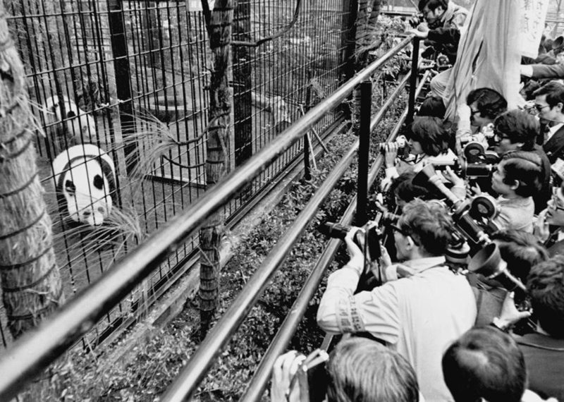 1972年10月28日,第一批旅日大熊貓“康康”和“蘭蘭”乘專(zhuān)機抵達東京,時(shí)任內閣官房長(cháng)官二階堂進(jìn)親自前往機場(chǎng)迎接。從機場(chǎng)到上野動(dòng)物園,一路由警車(chē)開(kāi)道、百余名警備人員護送。同年11月初,“康康”和“蘭蘭”首次公開(kāi)亮相時(shí),6萬(wàn)名游客將上野動(dòng)物園擠得水泄不通。次年,上野動(dòng)物園入場(chǎng)人數創(chuàng )下920萬(wàn)人的最高紀錄。日本動(dòng)漫《櫻桃小丸子》曾再現當時(shí)全民轟動(dòng)爭相一睹大熊貓的場(chǎng)面。