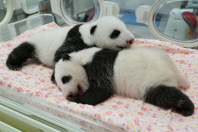 這是2021年8月5日拍攝的大熊貓幼崽“蕾蕾”(左)和“曉曉”(右)。新華社發(fā)(東京動(dòng)物園協(xié)會(huì )供圖)