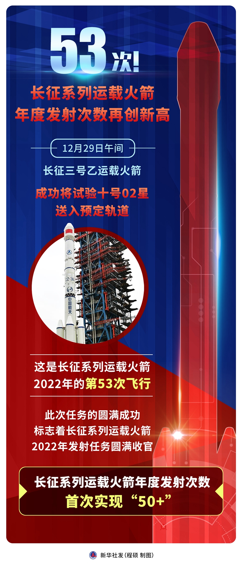 12月29日午間,長(cháng)征三號乙運載火箭成功將試驗十號02星送入預定軌道。這是長(cháng)征系列運載火箭2022年的第53次飛行。此次任務(wù)的圓滿(mǎn)成功標志著(zhù)長(cháng)征系列運載火箭2022年發(fā)射任務(wù)圓滿(mǎn)收官,長(cháng)征系列運載火箭年度發(fā)射次數首次實(shí)現“50+”。
