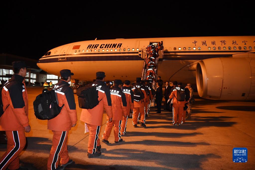 2月16日,在土耳其阿達納國際機場(chǎng),中國救援隊隊員準備乘坐國航包機回國。新華社記者 沙達提 攝