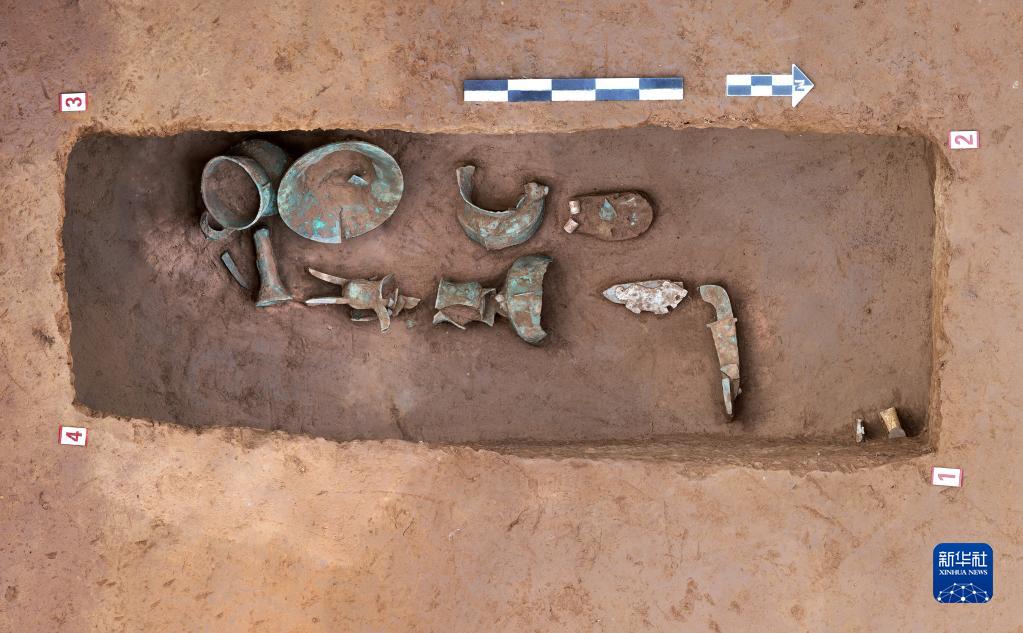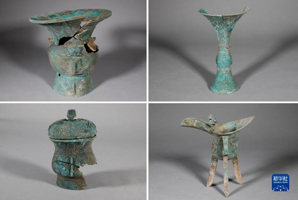 殷墟祭祀坑k23出土的青銅器(拼版照片)。新華社發(fā)