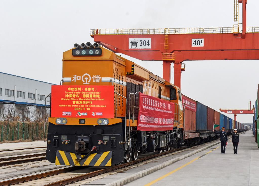 2022年2月18日,中歐班列(齊魯號)中國青島—德國曼海姆雙向對開(kāi)首班列車(chē)從上合示范區青島多式聯(lián)運中心出發(fā)。新華社發(fā)(王昭脈攝)