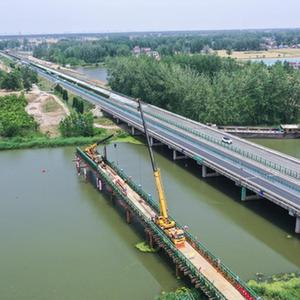 工人在長(cháng)深高速公路連云港至淮安段擴建工程主體施工項目鋼筋混凝土集中加工及配送中心運送預制件(6月7日攝)。