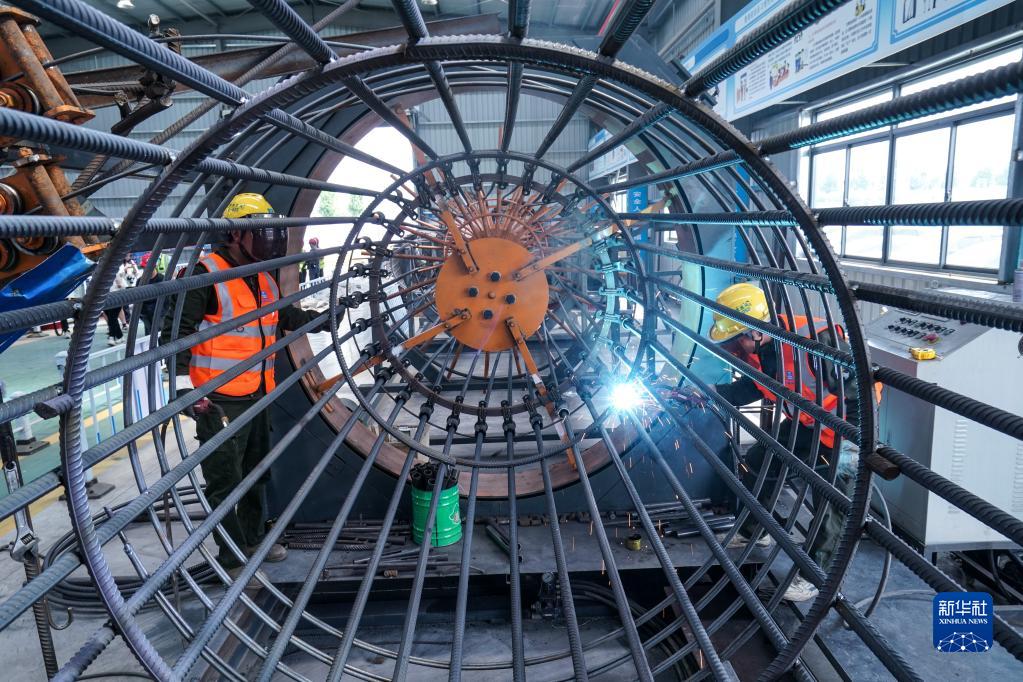 工人在長(cháng)深高速公路連云港至淮安段擴建工程主體施工項目鋼筋集中加工及配送中心加工預制件(6月7日攝)。