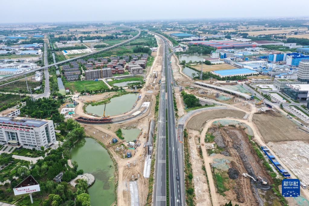工人在長(cháng)深高速公路連云港至淮安段擴建工程灌南互通工程現場(chǎng)施工(6月7日攝,無(wú)人機照片)。