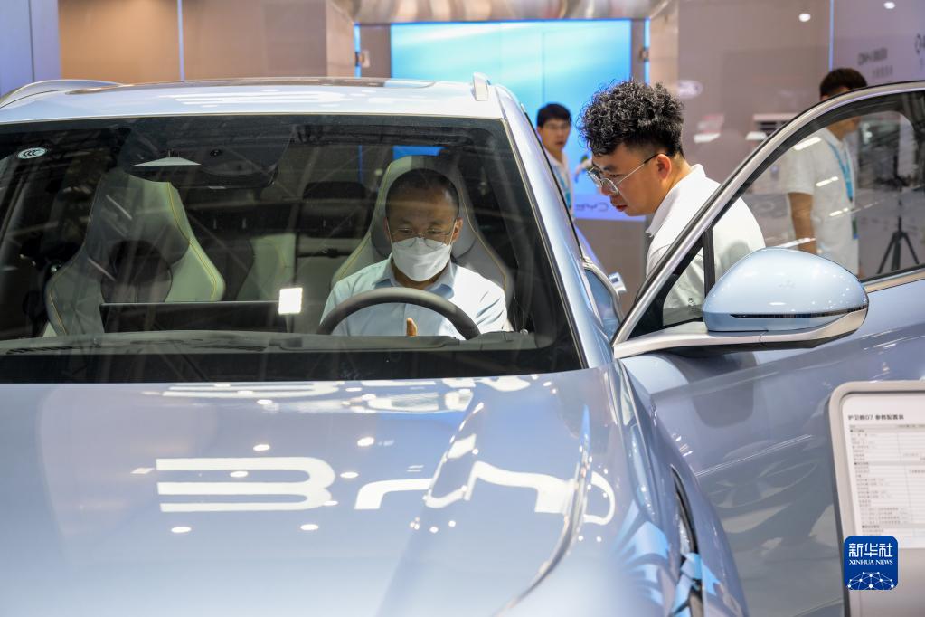 6月8日,觀(guān)眾(左)在車(chē)展上了解參展汽車(chē)。