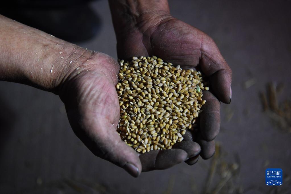 6月7日晚,袁營(yíng)村村民展示剛收獲的小麥。