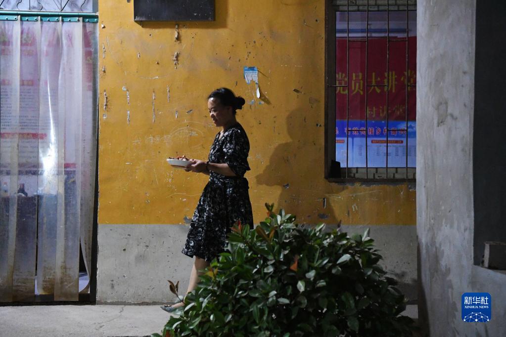 6月7日晚,村支部書(shū)記吳東星的妻子為搶收麥子的人們端菜。