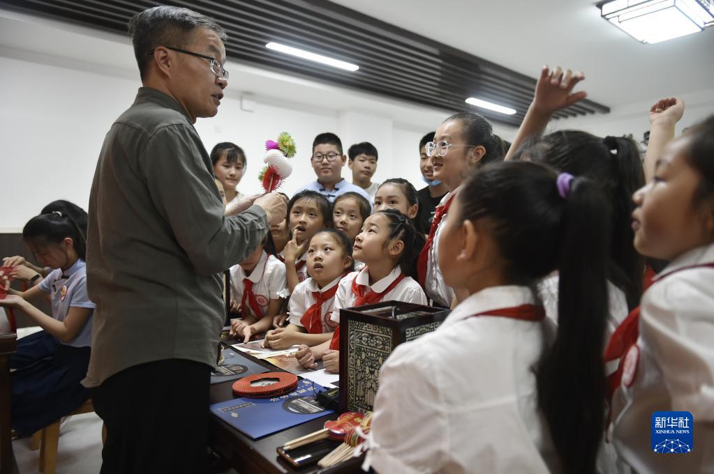 6月8日,張俊濤(前左)在鄭州經(jīng)濟技術(shù)開(kāi)發(fā)區列子小學(xué)參加非遺進(jìn)校園活動(dòng),向學(xué)生們介紹彩燈制作技藝。
