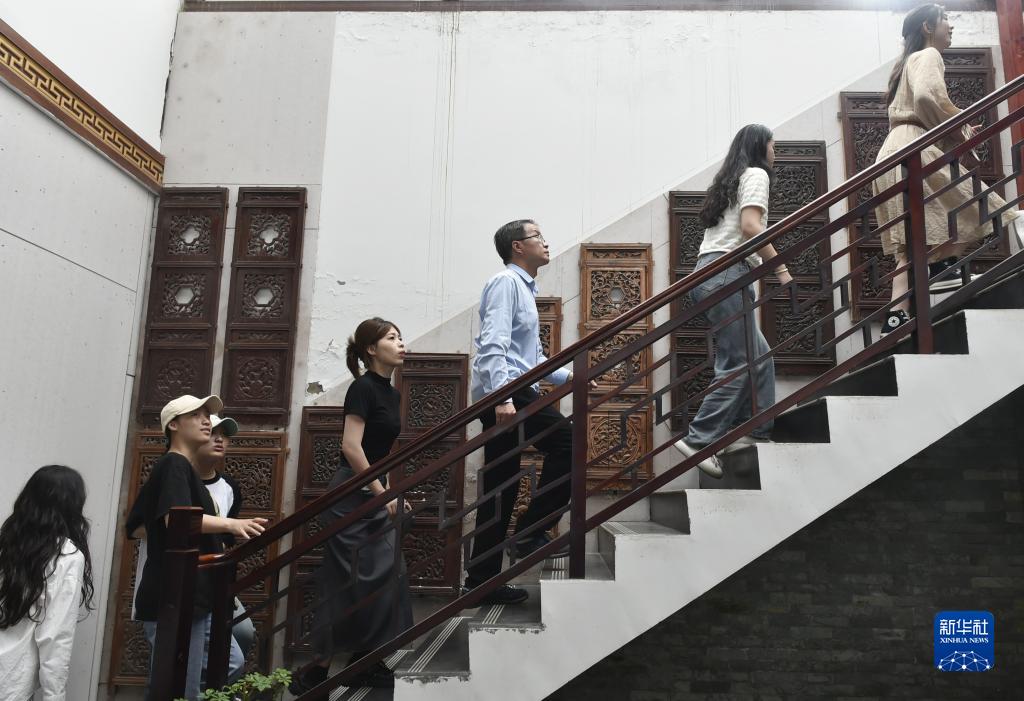 6月7日,張俊濤(右三)在開(kāi)封市“汴京燈籠張”彩燈展覽館內帶領(lǐng)來(lái)訪(fǎng)的大學(xué)生們參觀(guān)。