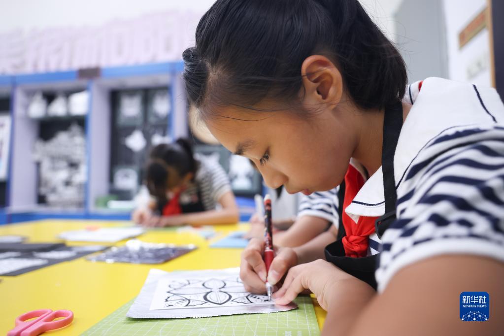 6月9日,湖南省長(cháng)沙市朝陽(yáng)小學(xué)學(xué)生在特色美育課上制作有苗族銀飾特色的手工作品。